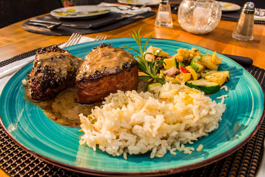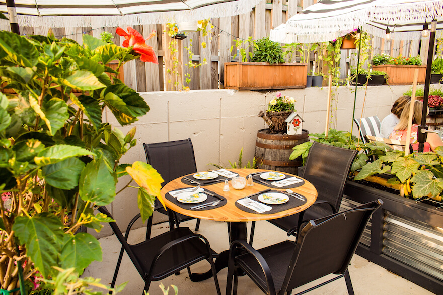 “Everything is made from scratch, and we grow all our own vegetables and herbs on site, so for instance, for our Caesar salad, we grow the romaine here,” he says. “You’ve heard of farm to table — we’re farm and table.”