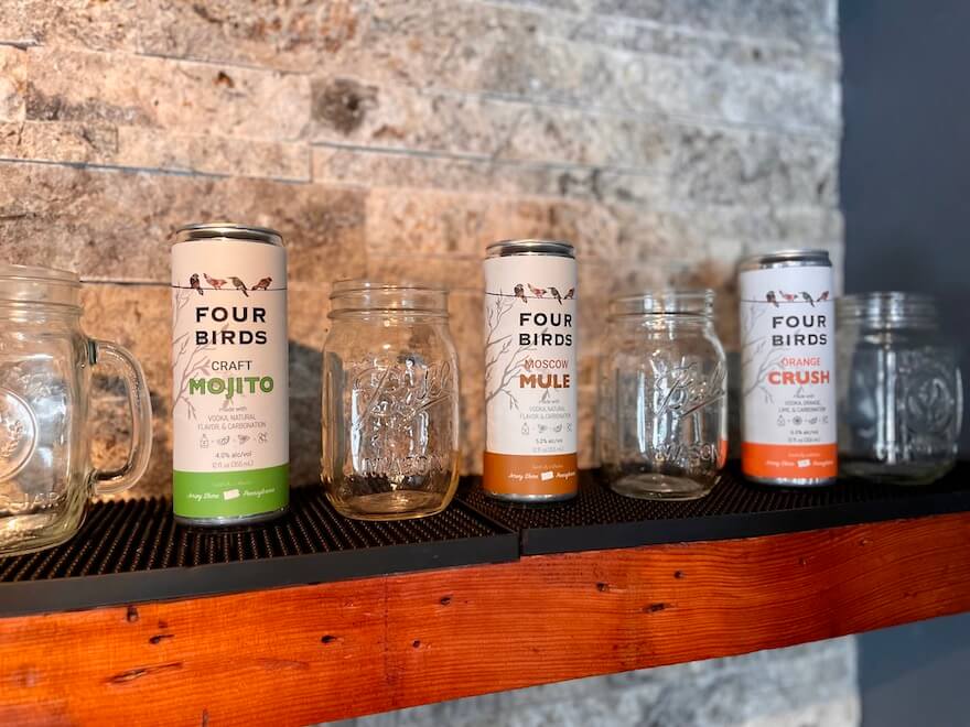 Four Birds launched with its own line of canned cocktails, including orange crush, Moscow mule and mojito, as well as bottled craft vodka. They started self-distributing to bars in the region, and have been working on getting on the shelves in more Pennsylvania Fine Wine & Good Spirits stores between Philadelphia and Scranton.