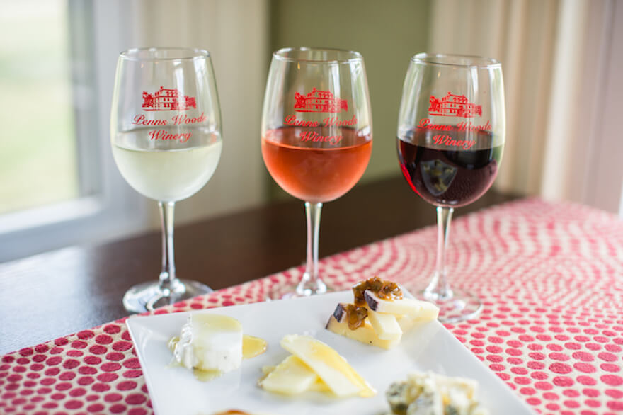 Visitors to Penns Woods can enjoy beautiful views of the vineyards from the dog-friendly outdoor lawn or comfy seating indoors or on the covered patio. Wine can be enjoyed by the glass, the bottle, or in flights; local beer, cider and cheeses are also available. Check the events calendar for happenings, like live music, festivals and special tastings.