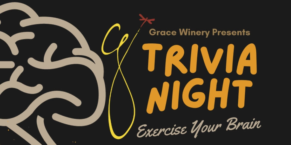 Join us on the first Friday of every month for Trivia Nights at Grace Winery! Arrival Time: 5:30 to register Pre-register via email: wineclub@gracewinery.com Prizes Include: First Place- 25$ gift certificate Second Place $15 Gift Certificate Mid-Round Prizes: Surprise!