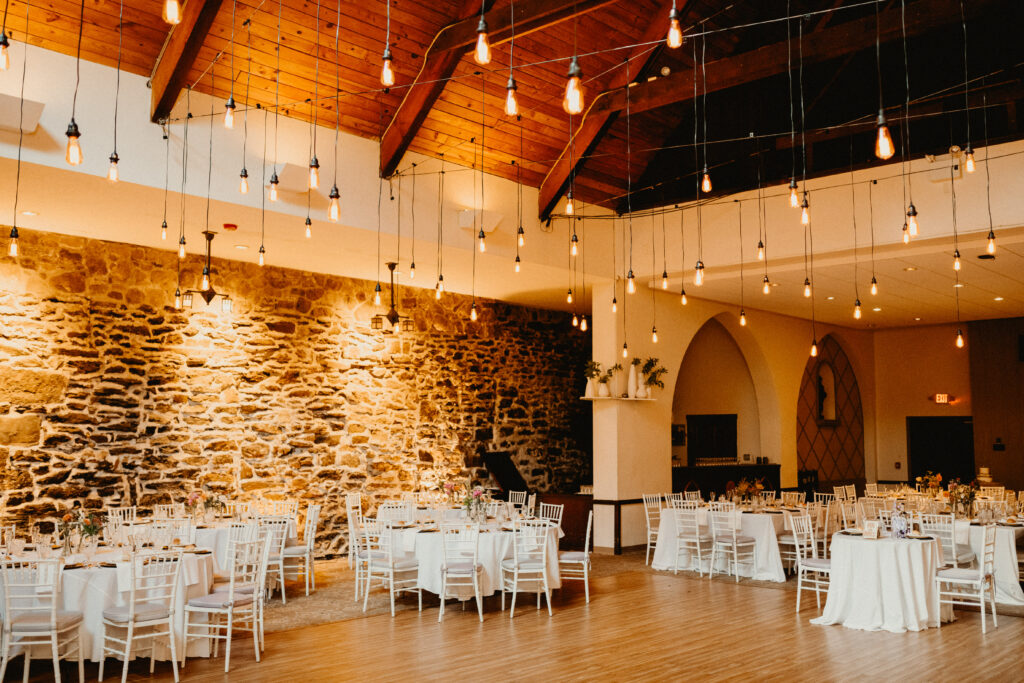 Ivy-covered courtyards and old stone walls provide the backdrop for this unique Delaware County wedding venue in Rose Valley. The large ballroom with cathedral ceilings and working fireplace will host 250 seated guests.