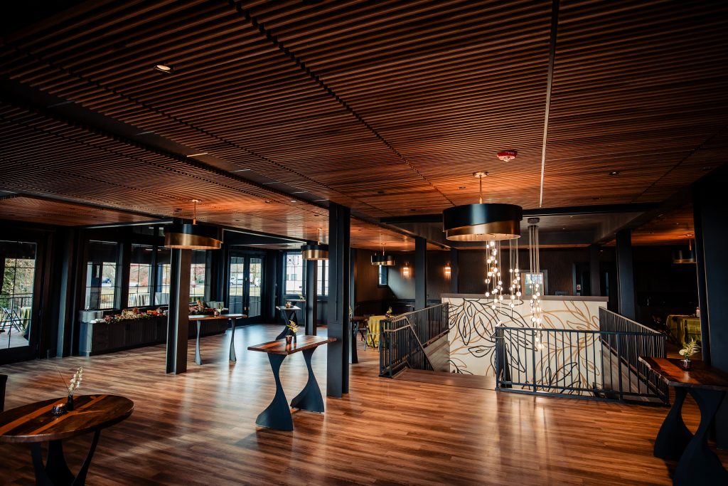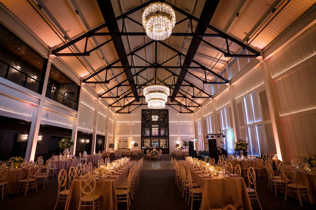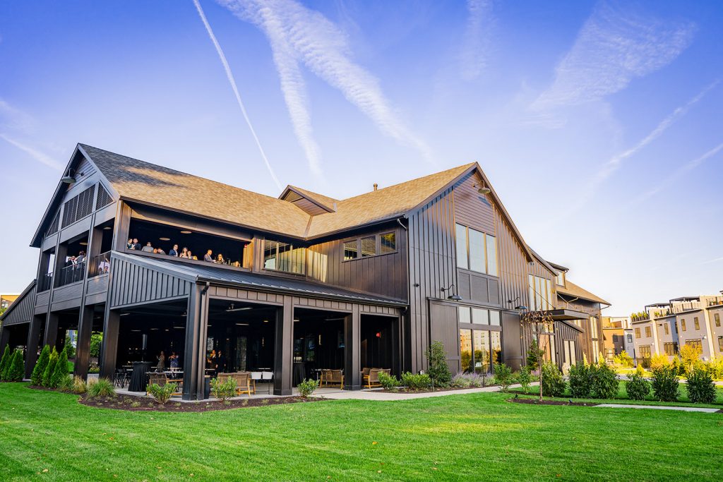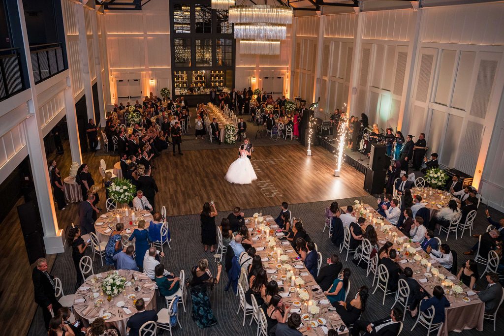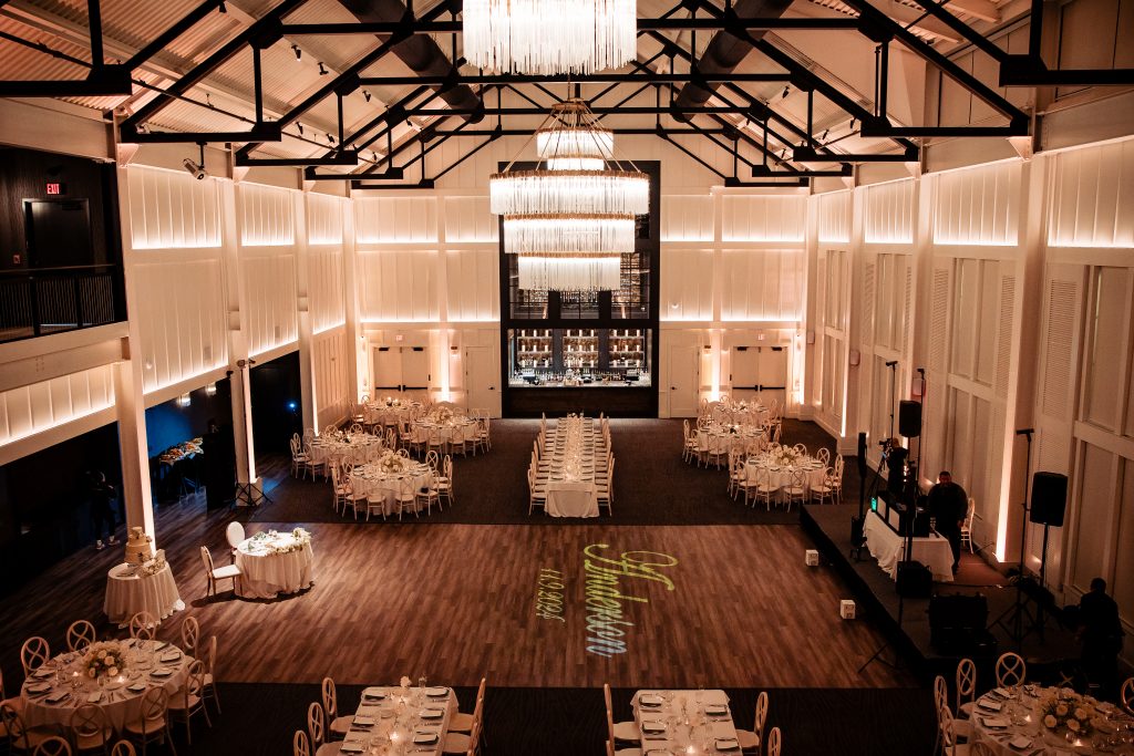 The rustic chic building reflects an upscale barn with striking lighting and modern fixtures, providing a cozy setting in a spacious venue. It features a covered ceremony space outside. Upstairs, the second floor includes indoor and outdoor covered spaces ideal for cocktail hour overlooking the ballroom. Then, enjoy dinner and dancing inside its breathtaking first floor ballroom.